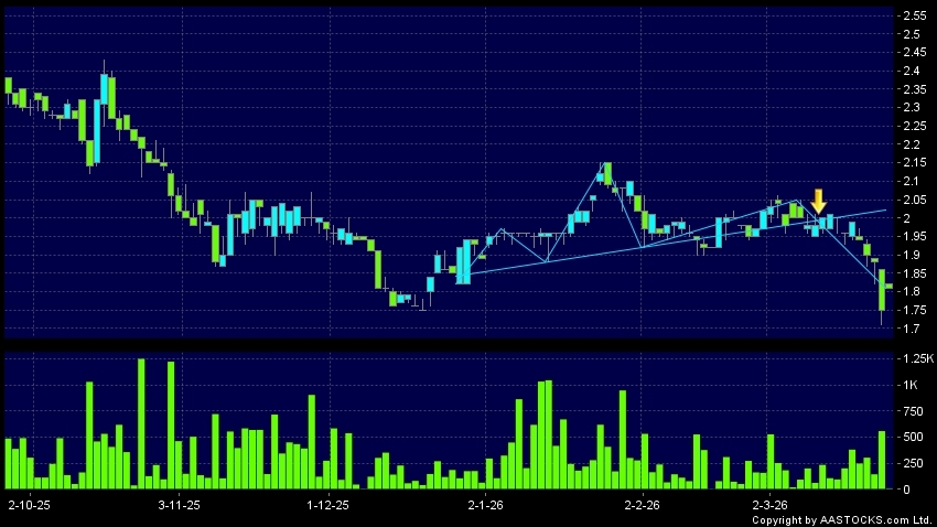 SINOMEDIA(00623.HK)  +0.010 (+0.532%)   appears a downside breakout, dropped below the neckline. Last printed at 1.810; rose 3.429%; on volume of 10.00K shares and turnover of $18.20K