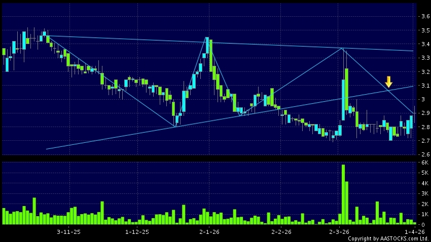 Triangle Breakout means the volatility of price movement is decreasing, stock price finally broke the bottom of triangle. A downward trend will start.(HK stocks quote is delayed for at least 15 mins.)