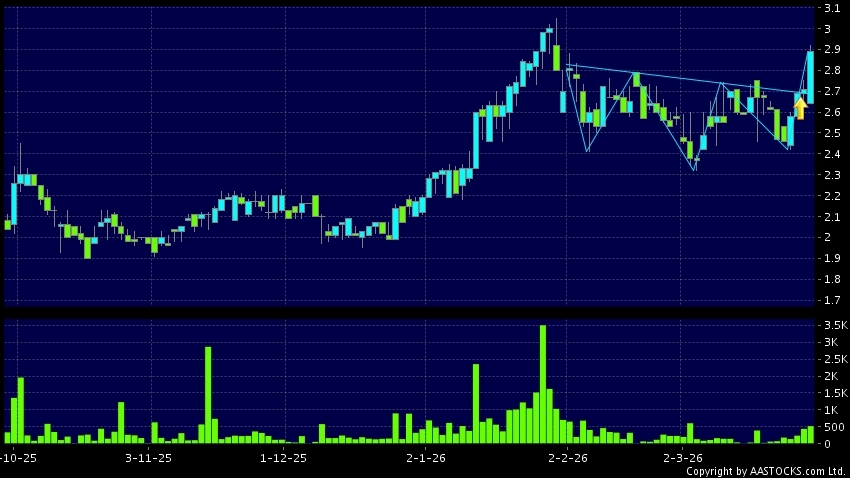 EDIANYUN(02416.HK) appears an upside breakout, rose above the neckline. Last printed at 2.910; rose 7.380%; on volume of 563.50K shares and turnover of $1.61MRecent PerformanceIn 3...