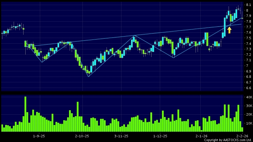 头肩底是典型的利好讯号,当股价升穿阻力线时,升势确认股价将持续上升,技术走势向好。(港股报价延迟最少十五分钟。沽空资料截至 2026-02-26 16:25。)