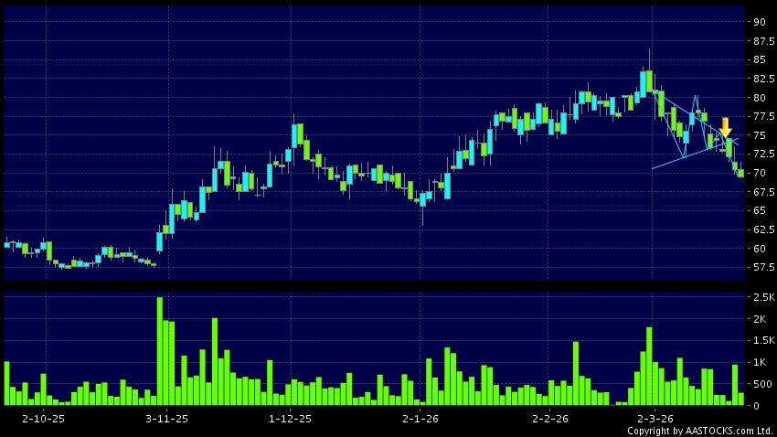 三角形向下突破是指股价的波幅渐渐收窄,在图表上形成三角形般的状态。股价在三角形的末端向下突破,下跌趋势形成,技术走势偏软。(港股报价延迟最少十五分钟。沽空资料截至 2026-03-31 16:25。)