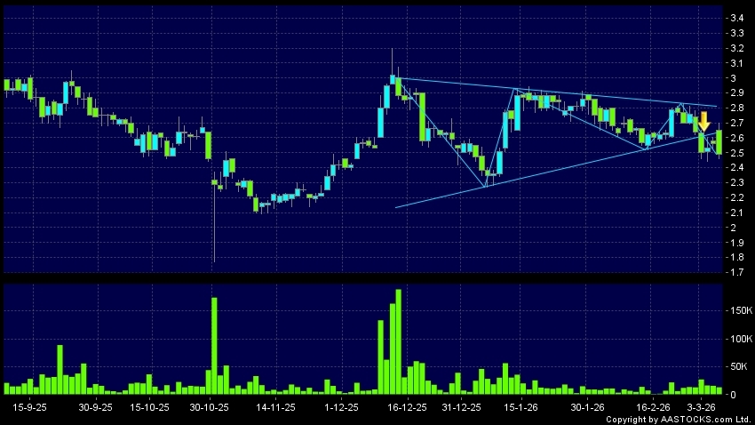 三角形向下突破是指股价的波幅渐渐收窄,在图表上形成三角形般的状态。股价在三角形的末端向下突破,下跌趋势形成,技术走势偏软。(港股报价延迟最少十五分钟。沽空资料截至 2026-03-06 16:25。)