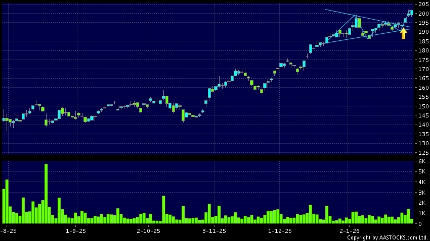 三角形向上突破是指股价的波幅渐渐收窄,在图表上形成三角形般的状态。股价在三角形的末端向上突破,形成上升趋势,技术走势向好。(港股报价延迟最少十五分钟。沽空资料截至 2026-01-30 16:25。)