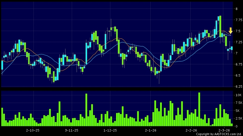 死亡交叉是一個利淡信號,指股價的短期移動平均線跌穿長期移動平均線,例如50天線跌穿250天線,在圖表上構成交叉的形狀。股價通常會下跌形成一個下降趨勢,技術走勢偏軟。(港股報價延遲最少十五分鐘。沽空資料截至 2026-03-19 16:25。)
