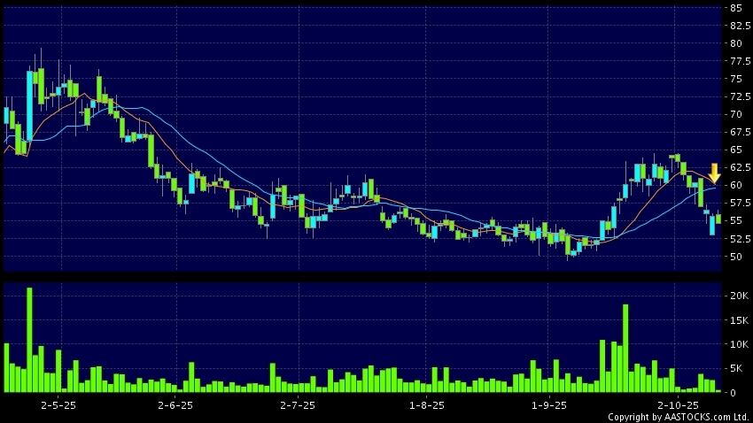 越疆(02432.HK) -3.150 (-5.660%) 沽空 $5.97百萬; 比率 5.118% 10天移動平均線跌穿20天移動平均線,出現死亡交叉。現價報54.000,下跌2.965%,成交量63.50萬股,成交額3.54千萬。