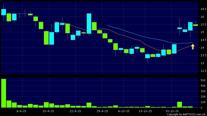 奧克斯電氣(02580.HK) -0.580 (-3.708%) 10天移動平均線升穿20天移動平均線,出現黃金交叉。現價報15.450,下跌1.215%,成交量38.16萬股,成交額5.94百萬。