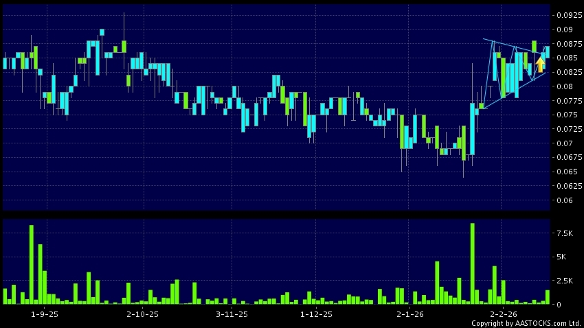 港龍中國地產(06968.HK) -0.001 (-1.235%) 呈現三角形向上突破。現價報0.087,上升1.163%,成交量1.50百萬股,成交額12.77萬。