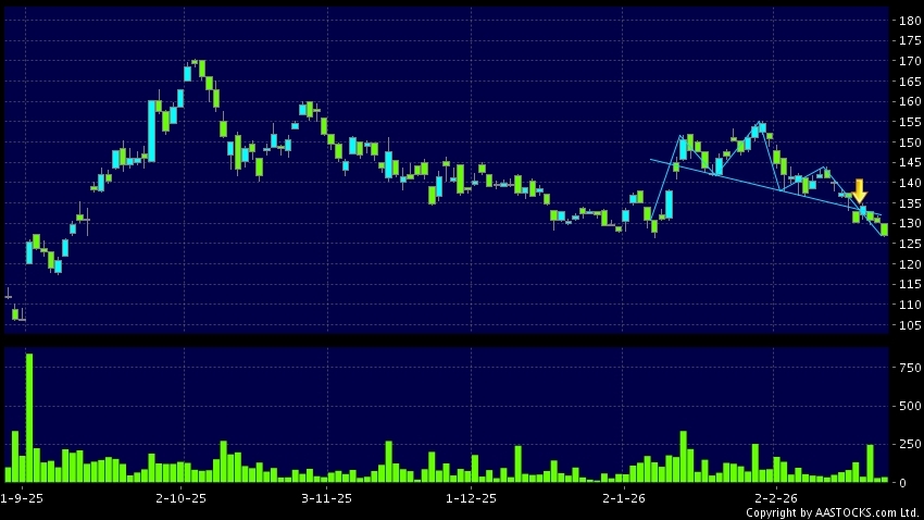頭肩頂是典型的沽出訊號,當股價跌穿支持線(頸線)時,跌勢確認股價將持續下跌,技術走勢偏軟。(港股報價延遲最少十五分鐘。沽空資料截至 2026-02-26 12:25。)