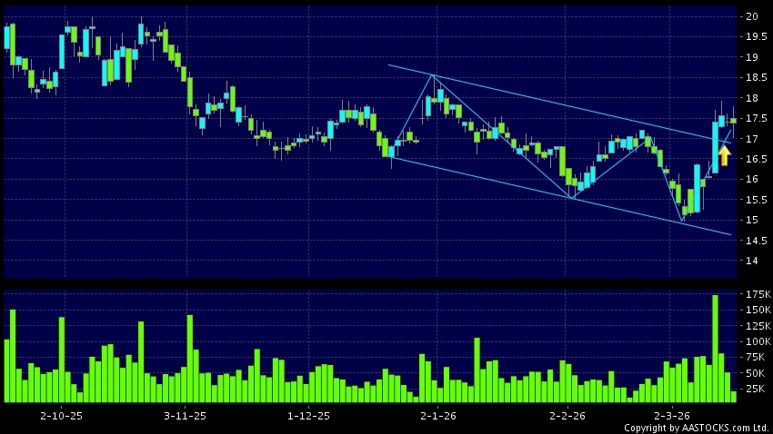 區域突破指股價在過去的一段時間只在一個範圍在內活動,然後股價上升作出突破,升穿區域的頂部,技術走勢向好。(港股報價延遲最少十五分鐘。沽空資料截至 2026-03-16 12:25。)